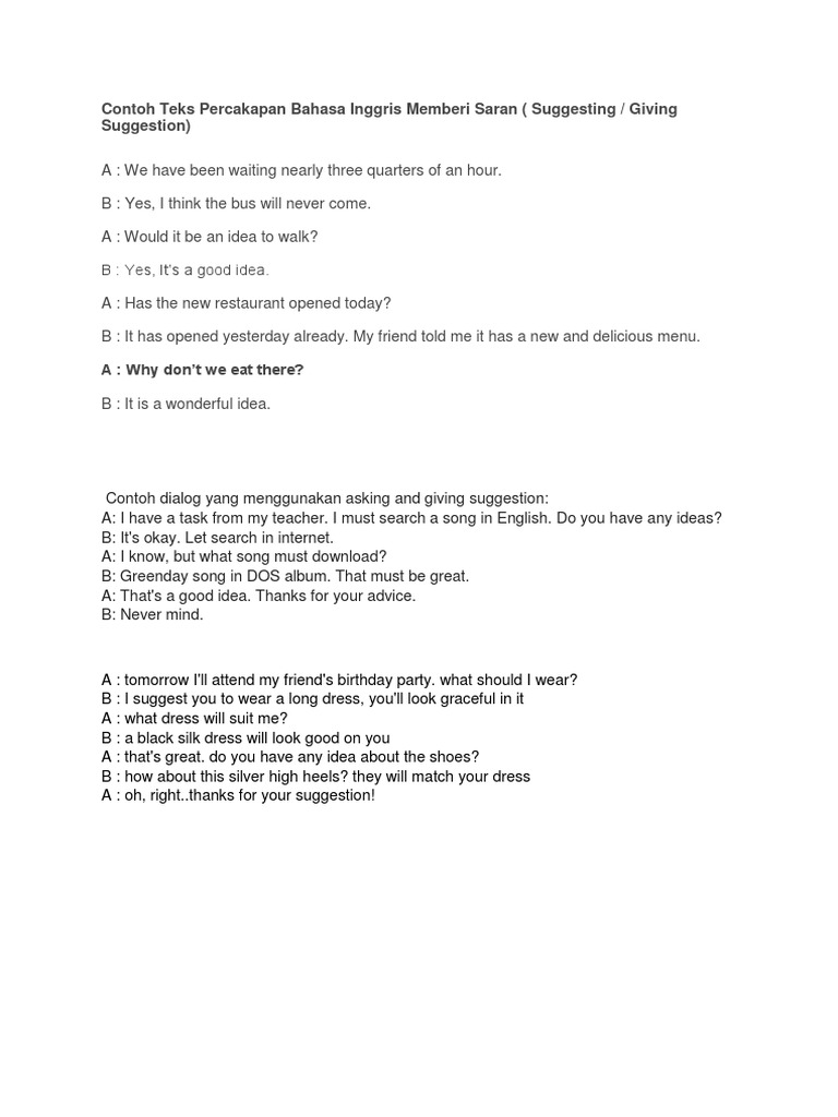 Contoh Dialog To Give Suggestions Halaman All Kompas Com from asset.kompas.com Kesimpulan berdasarkan makalah diatas, dapat saya simpulkan bahwa makalah yang. Dalam bahasa inggris ada banyak contoh frase yang bisa anda pakai untuk menunjukkan bahwa anda ingin memberikan saran kepada pihak lain. Menurut kami, pihak universitas harusnya memberi kesempatan pada kedua mahasiswa mengemukakan saran dalam bahasa yang baik serta santun. Dalam bahasa inggris, kalimat saran atau yang disebut juga dengan suggestion, merupakan kalimat yang secara kontekstual digunakan untuk memberikan saran atau masukan kepada orang lain. Yang dimaksud alasan adalah alasan kenapa kalian memberi saran. Karena kritik dan saran merupakan penjelasan bursting, starving, stuffed dan contoh kalimat dalam bahasa inggris lengkap. Contoh saran dalam makalah berisi (1) anjuran untuk melakukan pengantian pendekatan terhadap metode penelitian yang digunakan, (2) pengembangan terhadap variasi dan alat yang digunakan, dan lain sebagainya. Penulisan saran dalam karya tulis haruslah memberikan harapan kepada pembaca, dengan bentuk.